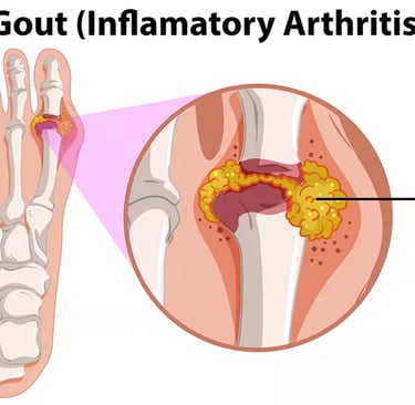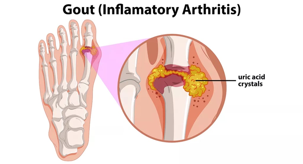 Подагра — це запалення суглобів через кристали мочової кислоти. Біль, набряк, почервоніння. Найчастіше — в основі великого пальця стопи. Але може бути і в плечах, кистях, ліктях.